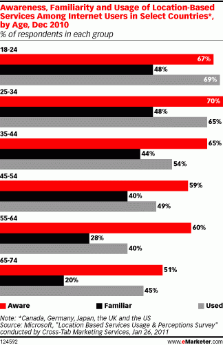 皮尤中心去年11月进行的调查发现,仅有4%美国网民使用地理位置服务。市场调研公司SNL Kagan则发现,2010年美国地理位置服务用户增长至近3倍。2010年12月,微软委托Cross-Tab Marketing Services针对加拿大、德国、日本、英国和美国市场进行的调查发现,大约十分之六互联网用户知道地理位置服务。最常见的是地图和天气应用,只有18%用户曾经使用过一款服务分享自己的地理位置。