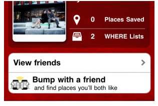 Bump是由一家叫做 WHERE 的公司开发的,他们最近拟推出的 iOS 和 Android 客户端基于在去年十二月推出的推荐引擎。这一引擎会分析用户之前的最喜欢去的地点以及他们的口味,并以此为依据给出对应的推荐信息。现在 Bump 和 Facebook 融合起来,用户可以把他们的信息发布到 Facebook 上,也可以寻找到更多使用这一应用的用户。现在你点开某个好友的主页,你就会发现一些地点被标为“Perfect Places”,这是基于你俩的喜好所作出的推荐。现在 Bump 与 Facebook 的连接还仅仅能完成寻找好友的任务。但是这已经足以将两个人联系起来,并给出他们俩可能都会喜欢的一些推荐了。