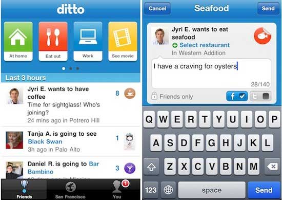 Ditto有趣之处在于,它不只是在做推荐,也是在规划将来的聚会。你用它提出一个想法或计划,看看有谁会响应:即你可以说你想去什么地方,看看有哪些朋友愿意加入。