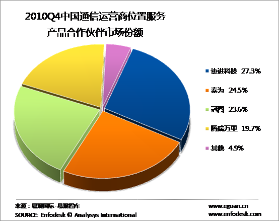 据Enfodesk易观智库产业数据库近期研究表明,中国位置服务市场近几年获得了快速的发展,以运营商为主导的位置服务业务也取得了较为明显的增长。现阶段和运营商合作的位置服务产品相对较为丰富,典型如天翼导航、导航犬、手机地图、手机导航等产品。运营商位置服务应用软件主要的合作伙伴集中在协进科技、腾瑞万里、冠图、高德、泰为等几家厂商中。