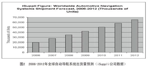 2001年,全球车用GPS硬件市场仅为34亿美元,预计2010年将达到219亿美元。根据iSuppli公司预测,2006年到2012年全球汽车导航系统的出货量的增长将超过三倍。2006年汽车导航系统出货量为1,980万台,到2012年汽车导航系统出货量将达6,510万台,增长3.28倍。