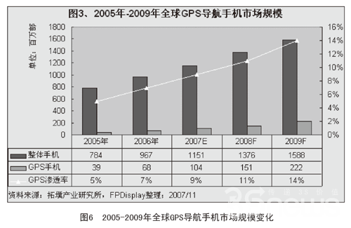 根据拓墣产业研究所的数据,2007年全球GPS手机出货量为1.1亿支,渗透率为9%。到2009年GPS手机出货量升至2.2亿支,比2007年翻一番,渗透率将达到14%。2008年全球GPS功能的移动电话将产生500亿美元的收入,到2012年这一数字将翻一番,达到1000亿美元。