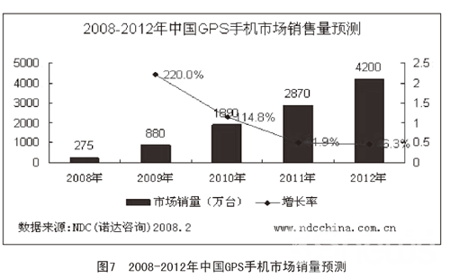 未来五年我国GPS手机将处于高速发展阶段。根据In-Stat的研究报告,2007年中国GPS手机市场出货量正规渠道达到近100万,是2006年出货量的8倍。诺达咨询公司预测:未来五年内我国GPS手机将处于高速发展阶段。预计2008~2012年,中国GPS手机市场销售量将由2008年的275万台,上升到2012年的4200万台。2008年5月有关部门对网民关注度调查显示,对GPS手机定位的关注度列第四,仅低于影音娱乐、双待和上网。