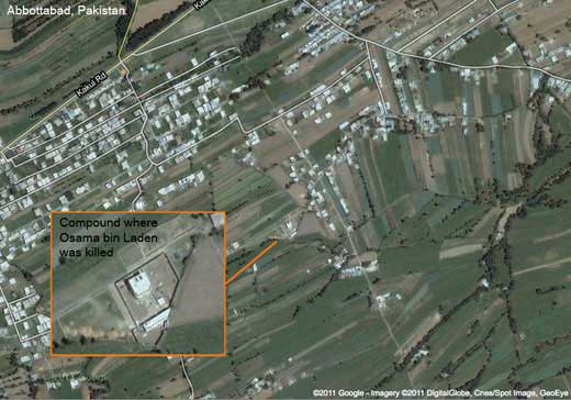 据国外媒体报道,谷歌近日对外公布了本拉登最后被击毙之地的卫星地图,从该地图上可清晰的看到事发地的基本影像。谷歌地图甚至还用红色符号清楚的标志出本拉登的住处以及其所在郊区的名称。