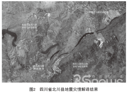 国家卫星气象中心应用CBERS-02BCCD和HR融合资料,通过监测四川汶川地震区的植被变化分析、三维地形分析和堰塞湖分布分析,确定地震灾区的滑坡体的影像特征和光谱特性。采用区域增长分析方法,解释北川县全区滑坡、堰塞湖的空间分布位置状况和走向。图2和图3所示的是资源卫星02B星对汶川地震中北川县灾害监测及解译图。四川省林业调查规划院应用CBERS-02B数据,快速评估汶川地震对森林资源损失。应用CBERS-02B图像,解译出灾区地震及次生山地灾害产生的崩塌、滑坡、泥石流及堰塞湖淹没与泄洪冲毁等灾害迹地,然后叠加在近年完成的森林资源分布图、自然保护区布局图、植被类型分布图等专题资料,进行灾害损失评估和影响分析。