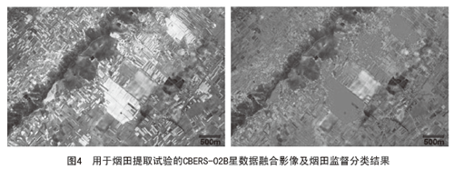 广西壮族自治区气象减灾研究所和广西壮族自治区遥感中心,应用02B星遥感资料,通过光谱分析法,分析研究油菜作物的光谱反射特性,建立油菜作物遥感信息识别模型,并利用该模型对云南省罗平县油菜作物进行信息提取研究。中国科学院遥感应用研究所、国家遥感应用工程技术研究中心和中国矿业大学,利用CBERS-02B星数据监测云南省烟草种植面积(如图4所示)。中国热带农业科学院橡胶研究所、海南省环境科学研究院和中国科学院西双版纳植物园,应用基于RS(Remote Sensing)和GIS(Geographical Information System)技术研究,和寻找海南地区适宜种植橡胶的地区。塔里木大学植物科技学院应用CBERS-02卫星遥感数据,在中国重要的棉花产区新疆南疆地区,准确及时地获取棉区播种面积及长势状况。辽宁工程技术大学测绘与地理科学学院与中国科学院地理科学与资源研究所,在黄河下游引黄灌区,利用CBERS-02B影像,监测黄河中下游地区冬小麦的播种面积和空间分布情况。