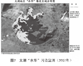 中国科学院地理科学与资源研究所与武汉大学合作,利用多时相CBERS-02 CCD数据检测枯梢或死亡人工刺槐林,为森林管理者提供性价比高、简单、可靠的森林健康状况的检测方法。北京林业大学水土保持学院应用CBERS CCD数据,在宁夏盐池县进行植被覆盖度动态变化监测研究。中国矿业大学测绘与空间信息工程研究所与河北省煤田物测队合作,在徐州市应用多时相CBERS影像,分析矿业城市植被景观变化。海南省环境监测中心站应用CBERS遥感影像对海南生态进行遥感监测研究。江西省环境保护科学研究院将CBERS系列卫星数据广泛的应用于环境保护、生态建设规划等各个方面,如在井冈山、浮梁、铜鼓等生态县建设规划,九江出口加工区等生态工业园区建设规划及相关环境影响评价等。中国资源卫星应用中心利用多时相CBERS CCD数据无锡城镇扩展分析及太湖“水华”监测(图6、图7)。河北省气象科学研究所与河北省气象与生态环在境实验室合作,应用多时相的中巴地球资源系列卫星数据,监测在曹妃甸工业区的建设。