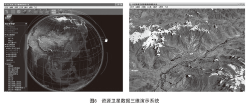信息工程技术研究所应用中巴地球资源卫星,开展探测海上船只能力的研究。应用中巴地球资源卫星CCD数据,同时结合能够有效地显示船只的样片及其属性信息(长、宽、航速等),进行综合统计分析,成功的捕捉到海上船只。湖南师范大学应用CBERS-02B卫星遥感数据,在庐山教学实习基地,为高校GIS专业的学生编制一套包括地质、地貌、植被、土壤、遥感目视解译以及地形图判读与填图等内容的实习专用图件的教具,提高综合地理实习教学的效果。中国地图出版社应用中巴地球资源卫星遥感影像,开展辅助地图制图的研究和应用。北京合众思壮科技股份有限公司在文物普查和动物保护监测中,将中巴地球资源卫星遥感图像应用于GIS采集器中,进行了应用试验。北京合众思壮科技股份有限公司开展了遥感影像在应急装备与减灾服务中的应用研究。在汶川大地震中,将中巴地球资源卫星 CCD数据加入到卫星导航兼容系统应急装备中。图8所示的是资源卫星三维演示系统。