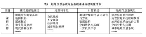 制订培养计划必须充分考虑学科发展前沿和市场需求,特别是要对未来几年学科发展进行预测,使培养计划具有前瞻性,因此我们提出设置地理信息科学、遥感信息科学、数字城市科学三个研究方向的方案,地理信息科学方向是本专业的基本方向,也是当前地理信息系统专业教育的主要方向;遥感信息科学方向则是根据当前部分高校设置“遥感科学与技术”(该专业为相关高校自主设立,尚未列入教育部专业大纲,目前武汉大学、西南交通大学、长安大学、南京气象学院等均已设置该专业)的现实以及遥感科学的快速发展、遥感与地理信息系统的密切关联与深入渗透设立的,以保证专业拓展的要求;数字城市科学则是将地理信息系统、资源环境与城乡规划管理、城市规划、信息工程等不同专业予以集成,面向城市信息化、数字城市与数字地球建设的需求设立的专业方向。课程设置方面实现核心竞争力、优势领域与学科专业特色的有机结合,特别是突出理工交叉渗透的特点,合理设置课程体系。将专业基础课程划分为专业大类课组、测绘遥感地图组、地理科学组、计算机组、地理信息系统组五大课组,重点对后四个课组进行组合、优化,形成地理信息系统专业基础课课组模块化体系(表1)。可以看出,专业基础课的设置充分体现了厚基础、宽口径地培养模式要求,对于不同专业方向都具有较强的实用性。同时在遵循专业基础课组划分体系的基础上,进行三个专业方向课程组的划分、充实与完善。