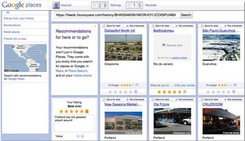 北京时间5月19日消息,据国外媒体报道,谷歌宣布在Google Places加入一项新功能,用户可以将地理位置服务Foursquare中的签到数据导入到Google Places中进行评分和评论。用户只需将Foursquare个人资料的信息源地址复制到Google Places的搜索框中就可以使用这一功能。