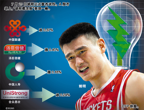 “姚明退役后,这些上市公司影响会逐步削弱,这个光环对上市公司的影响力也会慢慢弱化。姚明概念股退潮是不争的事实。”广州某券商市场人士表示。