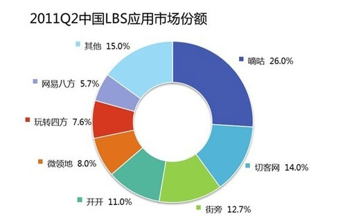根据易观国际Enfodesk产业数据库《2011年第2季度中国LBS市场监测报告》显示,2011年第2季度,嘀咕、切客网及街旁占据中国LBS应用市场前三名的位置。