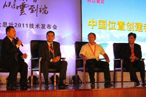 在随后举行的“中国位置”创建者论坛中,合众思壮技术副总裁曹红杰、合众思壮战略副总裁黄海晖、IBM 大中华区电子商务与销售中心软件部总经理任群力、中科院地理科学与资源研究所研究员陈荣国与合众思壮代表共同探讨了中国位置服务市场的发展前景,本着“开放、联合、共赢”的原则,将从国家地理信息基础设施投入、电子地图、移动通信、云计算、空间地理数据库等各领域合力构建“中国位置”服务市场。