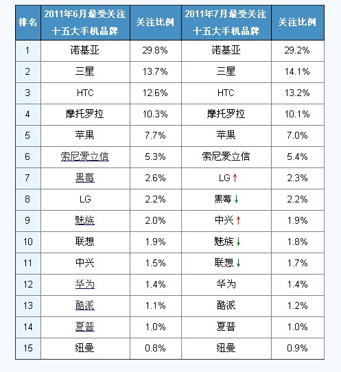 表 2011年6-7月中国手机市场品牌关注比例对比