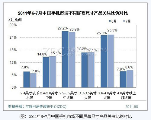 自2007年触摸屏手机成为流行趋势以来,手机屏幕尺寸就在变得越来越大。ZDC统计数据显示,2011年7月,3.2英寸以上大屏手机的用户关注度累计达到51.2%,较上月增长1%。其中4.0英寸以上超大屏手机关注比例较上月增长0.7个百分点,增长幅度明显。