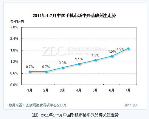 ZDC监测数据显示,2011年1-7月中国手机市场上,国产品牌中兴关注度上升明显,1-7月呈持续增长态势,7月达到1.9%,较1月增长了1.2个百分点。同时其品牌排名较上月上升两位,跻身前十。这跟中兴重视千元3G智能手机市场,与运营商密切合作有很大关系。