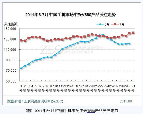 ZDC统计数据显示,7月中兴V880仍为最受用户关注的中兴产品,且本月其关注指数继续攀升,保持在13万左右的高位。这对国产品牌来说是个很好的启示,机海战术+明星机型不失为占领市场份额的有力武器。