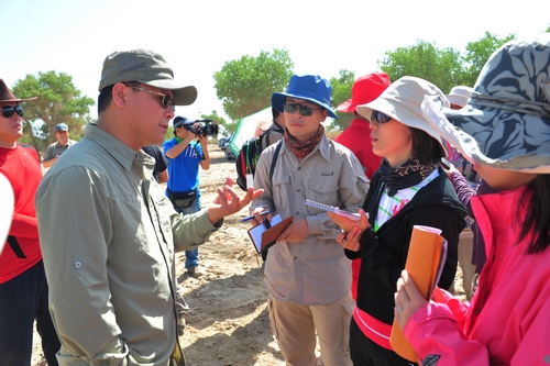 在茫茫沙海中,看到巍然屹立在沙丘上的绿色胡杨,不禁油然而生敬意。记者们踩着疏松的沙土,一步一个脚印跋涉前行。