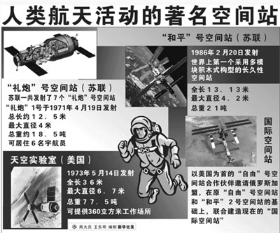 “和平”号空间站的设计工作始于1976年,1986年2月20日发射升空。2001年3月23日北京时间14时零分12秒,“和平”号空间站成功地坠毁在南太平洋预定海域。据统计,15年来,共有31艘“联盟”号载人飞船、62艘“进步”号货运飞船与“和平”号实现对接,另外自1995年到1998年,“和平”号空间站与美国航天飞机进行了8次对接飞行。