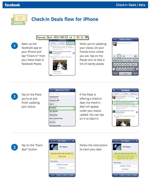 这招还有一个高明之处:本地广告策略。它的数据性更好,强信号也更多。Facebook对于签到优惠(check-in deals)的最新回应是:用户只要在Facebook上标出自己在哪里,就会被引向信息流(News Feed)页面。如果这一地点提供签到优惠,商家优惠项目就会出现在该条信息下方,然后人们可点击该优惠名称进入索取流程。"