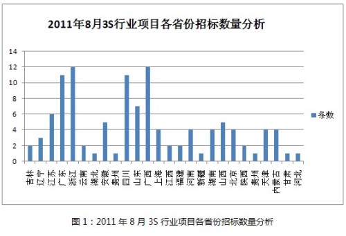 有26个省进行了与3S行业相关的公开招标,通过上面图1统计图表可以看出,本月3S行业项目地域分布打破了7月份平均分布的局面,明显呈现不均衡态势,浙江、广西省招投标条数最多,均为12条,广东和四川以11条的数量紧随其后,而以往较为活跃的湖北、新疆两省在本月则相对沉寂,都只有1条招标信息。值得注意的是,本月进行公开招标的省份增至26个,达到近4个月的最大值,预示地理信息产业发展范围可能在不断扩大,有望延伸至以往未涉及的地区。