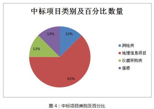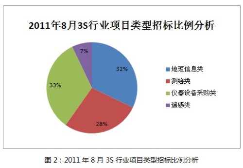 从图2可以看出本月项目延续7月份的地理信息类、测绘类、仪器设备采购三分天下局面,产业的各个方面仍处于均衡发展状态,遥感类项目比例也有所提升,但仍然不足10%。