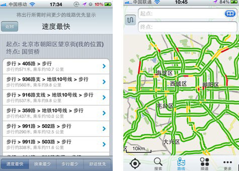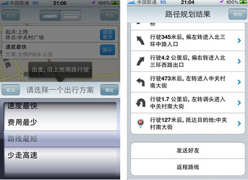 “高德地图”iPhone延续了Android版周边兴趣点快速搜索、多种路线规划,实时交通路况显示以及丰富的主题频道等功能,同时在地图显示和UI界面进行了优化升级:矢量地图及渲染解决方案,使得高德地图数据综合下载量仅相当于栅格瓦片地图的1/60;在界面设计上也是焕然一新,并且非常人性化。打开“高德地图”iPhone版客户端就能发现,相较于安卓版的界面,更生动、简洁、时尚。