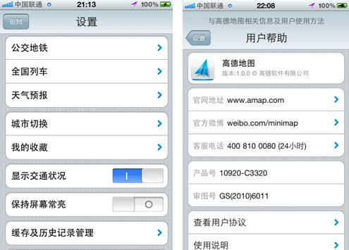 此外,在“设置”的版块中高德地图还增加了公交地铁、列车及天气预报等实用的小功能,并开设了意见反馈通道,以便于及时收到用户的反馈。同时还精心准备了用户使用说明,发布网站地址、客服电话、微博等多种联系方式,方便用户遇到问题时随时求助。