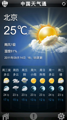 “中国天气通”可提供中国气象局发布的7天天气预报、实况及天气趋势信息,并于第一时间更新。用户可以获得全国2348个县级地区及国外重点城市的气象信息服务。