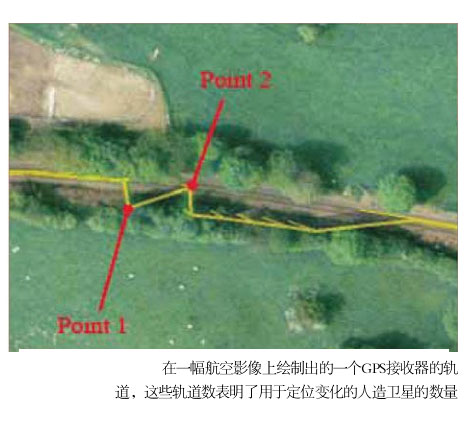 目前,许多国家都在修建高速铁路网,并且在铁路网的规划、建设和管理各个阶段都用到了基础地理信息技术。铁路系统的一个重要因素是安全性,虽然GNSS可以提供定位,但是如果将这种定位信息用于发射信号,就必须确保其100%的可靠。例如,右图显示了一幅航空影像上绘制出的一个GPS接收器的轨道,这些轨道数表明了用于定位变化的人造卫星的数量。目前的研究正在确定,如何使用现有的GNSS系统来获得完全可靠的信息,以解决安全问题。