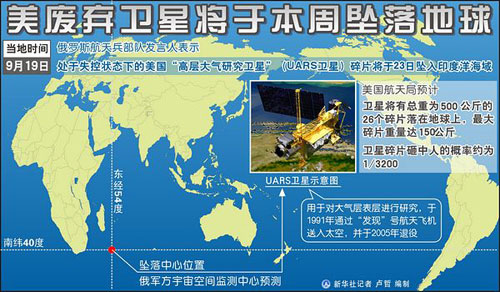这颗已经报废的美国“高层大气研究卫星”重达6吨,因燃料不足而失控坠落,预计23日左右穿越地球大气层后,总重500公斤的26个残留碎片将最终落在地球上的某个地方,砸中地球人的概率约为三千二百分之一。
