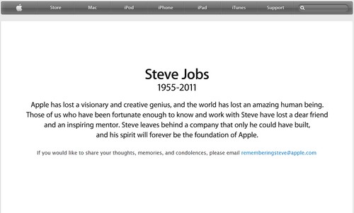 苹果公司官方网站首页目前已经更换为乔布斯的大幅照片,并且标有“1955-2011”字样,以此悼念乔布斯的逝世。苹果公司发布的讣告称:“苹果失去了一位富有远见和创造力的天才,世界失去了一位不可思议的人。我们有幸能结识并与史蒂夫一同工作,但此时我们却失去了这位良师益友。史蒂夫离开了只有他可以创建的苹果世界,但他的精神将永远成为苹果的根基。”
