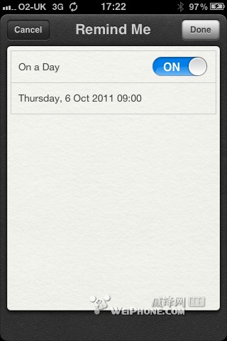 但是,在iOS 5 GM发布之后的几天里,我们注意到越来越多的用户说自己的iPhone 3GS上无法没有看到基于地理位置提醒的选项。如上图,就是在iPhone 3GS上运行的Reminders应用界面,地理位置开关直接未予显示。但在iPhone 4上(同样安装了iOS 5 GM)可以清楚地看到这个选项,请看下图。