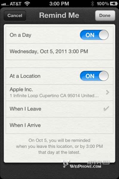 在iOS 5中有个新增的自带应用叫做Reminders(提醒事项),用过Things、Wunderlist或者其他todo类软件的朋友一定不会感到陌生。Reminders的一大亮点是它能够基于地理位置进行提醒,这就是说,当你到达或者离开某个地点时,Reminders就会提醒你该做什么事了。比如你在单位等待下班,想着回家路过超市时买袋猫粮,便可以把提醒地点设为超市。