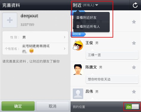 接下来,米聊还会提醒用户完善个人信息资料,让附近的朋友对你有一个初步的了解,点击确定之后,附近的好友就会以列表的形式展现在你面前。
