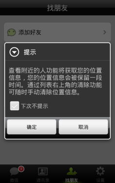在微信中,进入“查找附近的人”功能之后,微信也会有一个明显的提示信息,但是无法选择查找的对象是否为好友或陌生人。点击查找之后,微信便会直接进入好友查找过程,中途并无提醒完善资料,显得不够人性化。当然,在微信中也可以和米聊一样,直接清除自己的位置信息,以保证个人隐私安全。