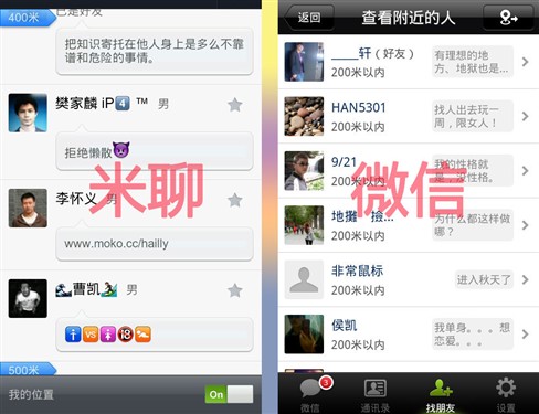 通过查找附近的人,来交友、聊天、甚至组织活动,看上去十分新奇有趣。但是米聊与微信相比,谁的LBS更好玩呢?与微信相比,米聊显得更具特色。