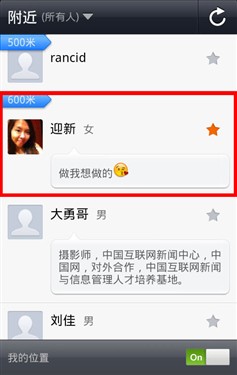 与微信不同,米聊在查找附近的人时,还为用户提供了“喜欢”功能。只要你对Ta感兴趣,你可以悄悄地在其名字后面加一颗星,以示爱意(如图5)。同时,对方也不会被打扰,只有Ta对你也加注星标之后,系统会自动将双方加为好友,并发来“你们互相喜欢对方”的提醒,显得更具神秘感,也让LBS功能更耐玩。与微信相比,米聊是不是让人多了一份期待感呢?