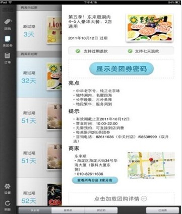据悉,美团网推出的iPad应用可以在一张页面看到所有信息,包括团购项目及种类、支付平台以及美团券的细分栏目。其中有两个亮点,是“快过期”和“附近的”两项功能。“快过期”是指依据时间轴对用户购买的团购单进行梳理对用户进行提醒,“附近的”则是依据空间轴的推荐,登录用户可看到已购买的团购单中有哪些是在自己周边。用户根据这两条轴,可有效管理自己的消费。