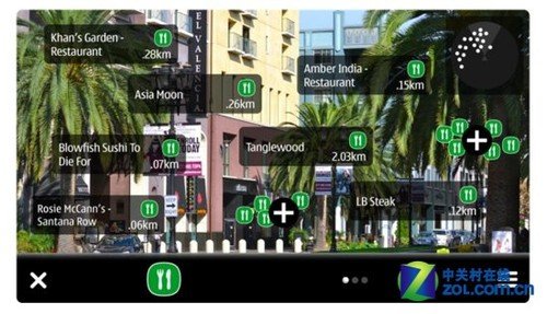 在于WP7产品发布的同时,诺基亚也发布了全球首款系统内置地图整合应用,该套地图整合应用是将地图数据、建筑、公共设施、人、物体等多种数据整合在一起,LiveView地图程序通过手机摄像头取景后,相关的街道、建筑物等名称会同步的显示在地图当中,同时用户通过点击周边的餐厅、商户以及旅游来获得更丰富的相关信息。