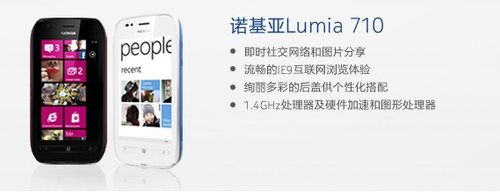 与诺基亚Lumia 800一同亮相的另一款WP 7.5机型名为Lumia 710,相对来说它的机身设计更加圆润一些,Lumia 710有墨黑和纯白两种可选颜色,并提供了墨黑、纯白、湖蓝、玫红、明黄五种颜色的后盖供用户进行个性化搭配。它拥有与诺基亚Lumia 800相同的高通MSM 1.4GHz处理器、硬件加速和图形处理器。