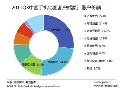 根据EnfoDesk易观智库产业数据库《2011年第3季度中国手机地图客户端市场监测报告》显示,谷歌地图、高德地图及诺基亚地图分别占据中国手机地图客户端用户市场前三名的位置。