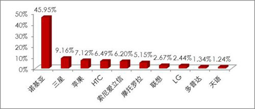 2011年,诺基亚(微博)依然占据最强势位置,其次是三星(微博)、苹果、HTC(微博)和索尼爱立信,其中苹果和HTC在用户中的增长是2011年手机品牌市场的最显著变化,这也从侧面反映了智能化的苹果ios和谷歌Android手机操作系统在用户间的受欢迎程度。