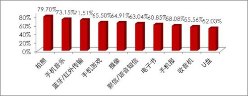 除手机上网外,手机拍照是2011年手机人最常使用的手机功能,79.7%的手机用户选择使用这一功能;其次手机音乐、蓝牙/红外传输,比例也都超过70%;不过从使用比例上来看,除拍照的领先优势较为明显外,其余手机使用行为差异逐步递减,差级不大。