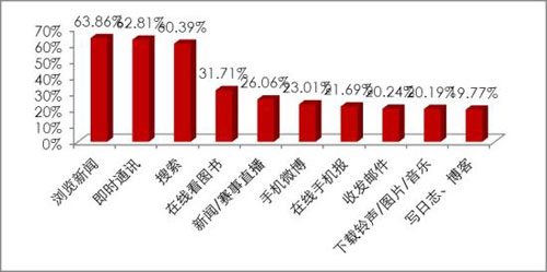 浏览新闻、即时通讯和搜索是手机人最经常的三大上网行为,比例均超过60%;其次是在线看书、新闻直播、手机微博、在线手机报、收发邮件、下载铃声/图片/音乐和写日记/博客,比例都在20%至30%之间。