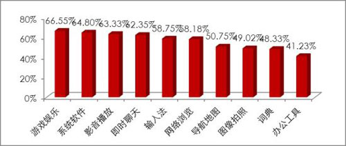 2011年,接近67%的手机用户最喜欢的游戏娱乐类的手机APP;第二受手机上网用户欢迎的是系统软件APP,该类APP的使用比例接近65%;影音播放和即时通讯,比例也超过60%;概括的说,娱乐类、手机使用类和工作学习类是手机上网用户最喜爱的手机应用。