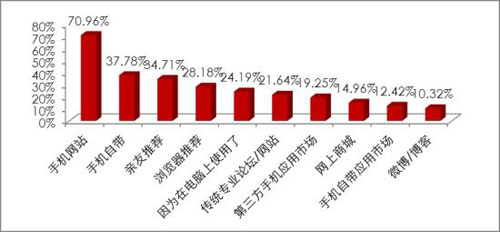 手机类网站是手机人获取APP信息最主要的渠道,人群比例超过70%,其次是通过手机自带和亲友推荐获得APP信息。