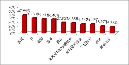 可以看到手机作为信息媒介的特点十分显著,新闻类资讯成为最受欢迎的资讯类型,比例将近50%。其次是书籍、地图、音乐信息。总体来讲,新闻类、娱乐类资讯以及生活工具类三个大类的资讯是最受手机上网用户欢迎的资讯。