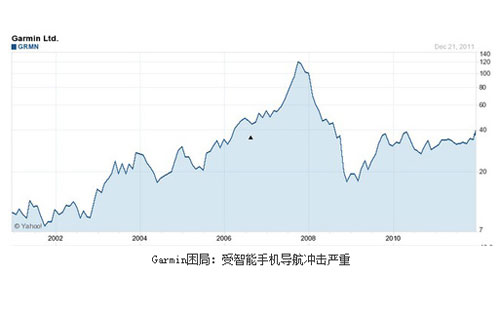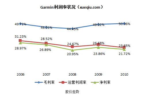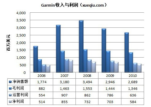 2009年和2010年,Garmin净销售额和利润都在下降。2010年,Garmin净销售同比下滑9%,主要由于车载/手机导航产品销售额下降(19%)所致,但户外及健身产品销售额同比增19%,航海产品销售额同比增12%,航空导航产品同比7%。净利润同比下降17%至5.84亿美元,净利率也由2009年的23.8%,下降至2010年的21.7%。