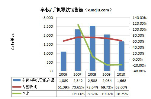上图是Garmin车载/手机导航产品销售额占总营收比重,以及同比变化情况:2007年该项业务销售额同比大增115%至23亿美元,占营收比重高达73.65%;但2008增速明显放缓至8%,2009年和2010年则呈现接近20%的负增长,占营收比重也逐渐下降。